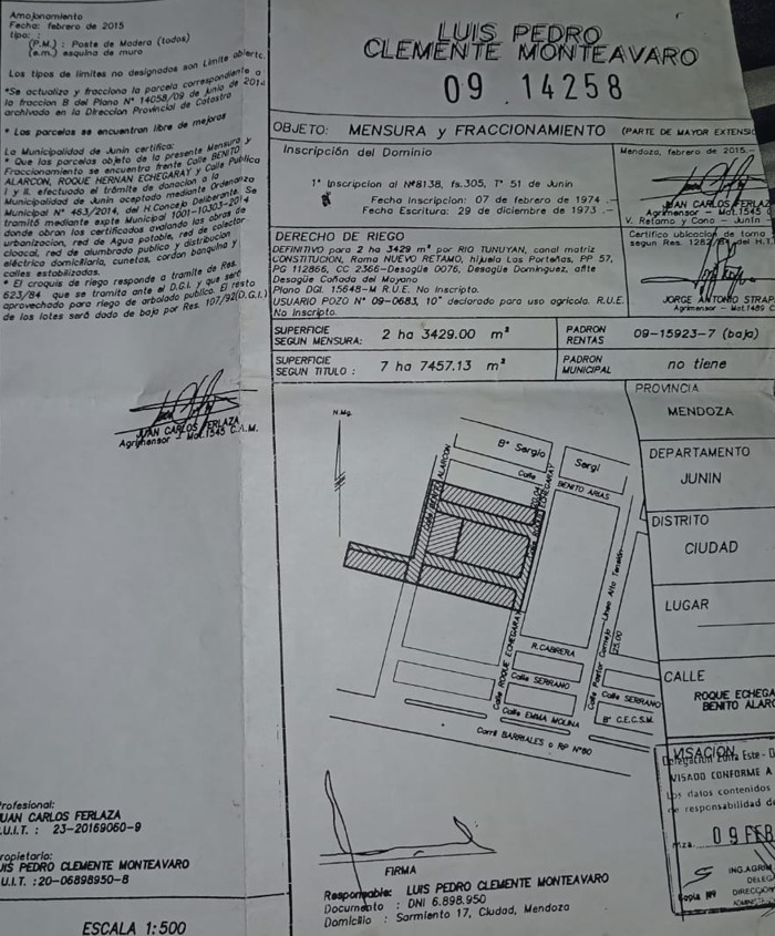 INMOMC VENDE EXCELENTE LOTE EN EL DEPARTAMENTO DE JUNIN, EL MISMO SE ENCUENTRA URBANIZADO EN PLENO DESARROLLO Y EXPANSIÓN CUENTA CON UNA SUPERFICIE TOTAL DE 480 METROS, CON 20 METROS DE FRENTE ORIENTACIÓN FRENTE NORTE Y FONDO SUR. EXCELENTE ENTORNO. LOTE 7 MAZN D. CALLES DE MENSURA ROQUE ECHEGARAY S/N Y BENITO ALARCON S/N.